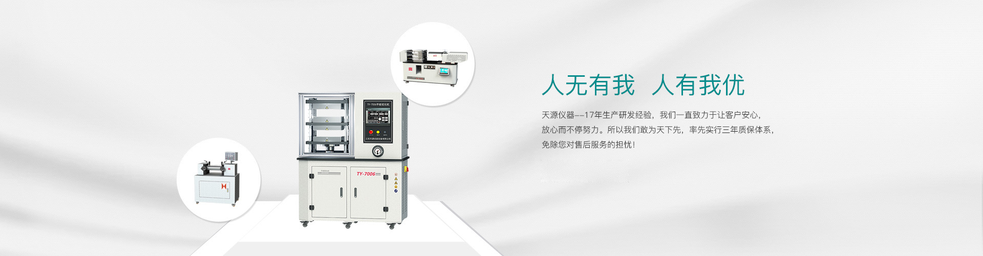 “江蘇天源”總投資約2600萬元,占地12000平方米,車間生產(chǎn)面積約5000平方米,辦公面積1500平方米,駐外辦事處5處,合作營(yíng)銷點(diǎn)9處。 國(guó)家級(jí)高新技術(shù)企業(yè)“江蘇天源”擁有自營(yíng)進(jìn)出口權(quán),并獲得30多項(xiàng)專利17個(gè)高新技術(shù)產(chǎn)品。我們本著中等價(jià)位,高端品質(zhì),無利高效的服務(wù)為理念,研發(fā)生產(chǎn)的電子萬能試驗(yàn)機(jī)系列和橡塑高分子檢測(cè)儀器獲得了3500多家單位的賞識(shí)!